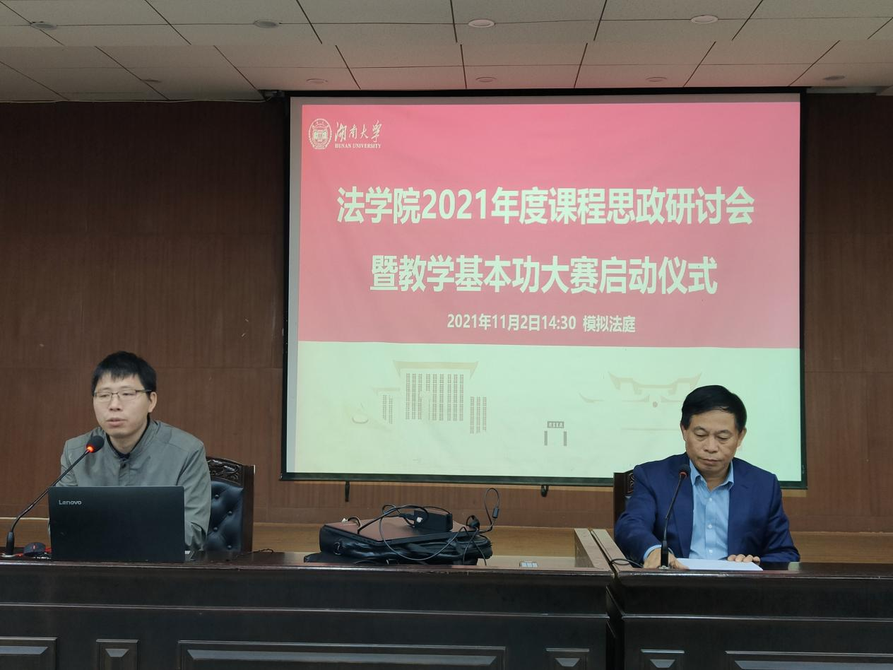 推进课程思政的新动态。蒋老师提出,关键要找准法学学科与思政的融合点,科学设计教学体系,分类推进课程思政建设,挖掘亮点,打造特色。他简要介绍了学院对法理学、宪法学、中国法律史、刑法、民法、行政法、程序法、国际法等核心课程进行课程思政的侧重方向,倡导以“千年学府、百年法学”为依托,弘扬湖大传统,打造湖大法科特色。他建议每个学科对学科课程思政有总体规划,每位老师对自己课程的思政建设也要凝练特色,切忌千篇一律。他还介绍了学院即将举行的教学基本功大赛组织情况,倡导老师们尤其是青年教师积极参赛,以赛促教,通过比赛更好设计课程,更新教育理念、掌握现代教学方法,同时为参加学校及更高层级教学比赛进行历练,积累经验。