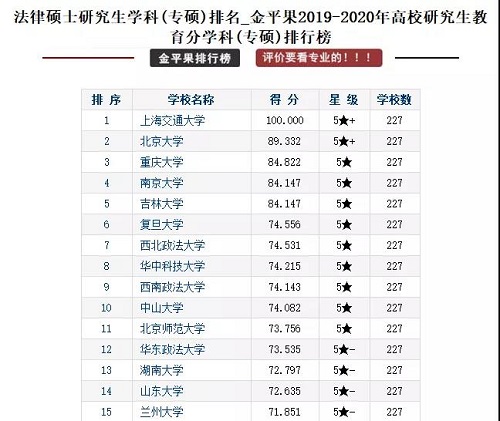 近年来,在院领导的高度重视和支持下,JM教育中心不断完善研究生培养制度、创新研究生培养模式,努力为学生提供良好的学习条件,营造积极向上的学习氛围,为学生学习专业知识、提升实践技能提供完备的服务保障。在本次评价报告中,我院的法律硕士获评5星学科,进一步展现了JM教育中心研究生培养质量的提升。在新的一年,JM教育中心将不忘初心、砥砺前行,培养更多、更优质的法律人才,为法治中国的建设贡献力量!此外,在“2019-2020年中国研究生教育分学科(专硕)竞争力排行榜”上,我校还有会计硕士、建筑学硕士、工商管理硕士、工程硕士、金融硕士、国际商务硕士、保险硕士、新闻与传播硕士、城市规划硕士获评5星学科。
