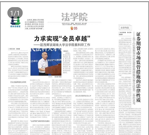 在实践教学方面,该学院专门成立了实践教学中心,设计了法律诊所和模拟法庭课程,暑假集中安排学生参与实习、“三下乡”等社会实践;与各级政法机关保持紧密合作,如与湖南省高级人民法院、湖南省人民检察院签订战略合作协议,共建大数据-人工智能与司法管理研究中心;与长沙市司法局合作,让学生更多参与到真实案件的法律援助中;聘请湖南省司法厅副厅长傅莉娟等5名“双千计划”实务专家挂职任教。