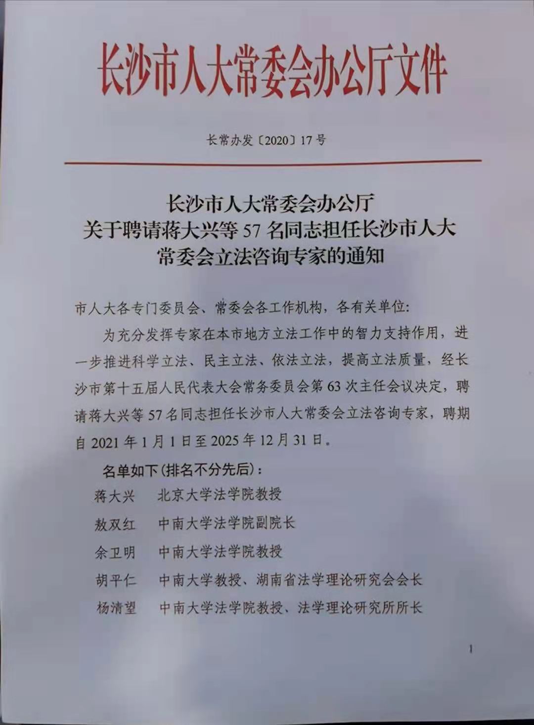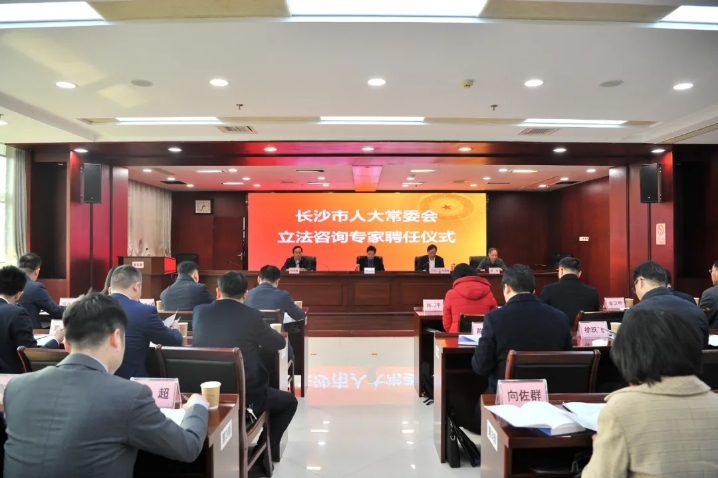 2020年12月21日下午,长沙市人大常委会举行立法咨询专家聘任会,正式聘请57位同志作为市人大常委会新一届立法咨询专家。我院教师高中、郭哲、唐双娥当选。市人大常委会主任谢卫东为专家颁发聘书并讲话,市人大常委会副主任王国海主持聘任会,市人大常委会秘书长柳美景出席。依托立法咨询工作,专家们可充分发挥专业优势和学术特长,为地方立法提供专业支撑和智力支持。