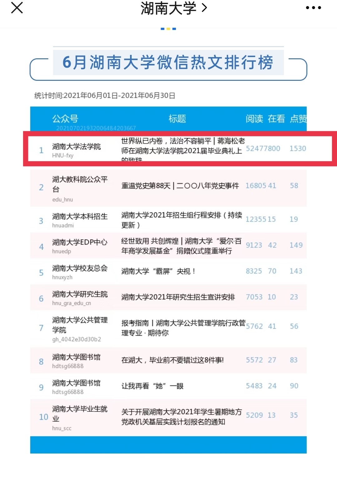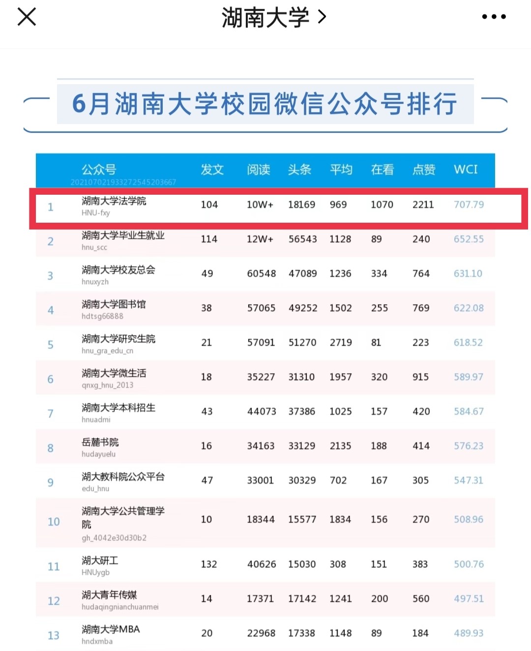 蝉联湖大校园新媒体影响力十强榜单,并在6月榜单中跃居全校新媒体排行榜第一名。