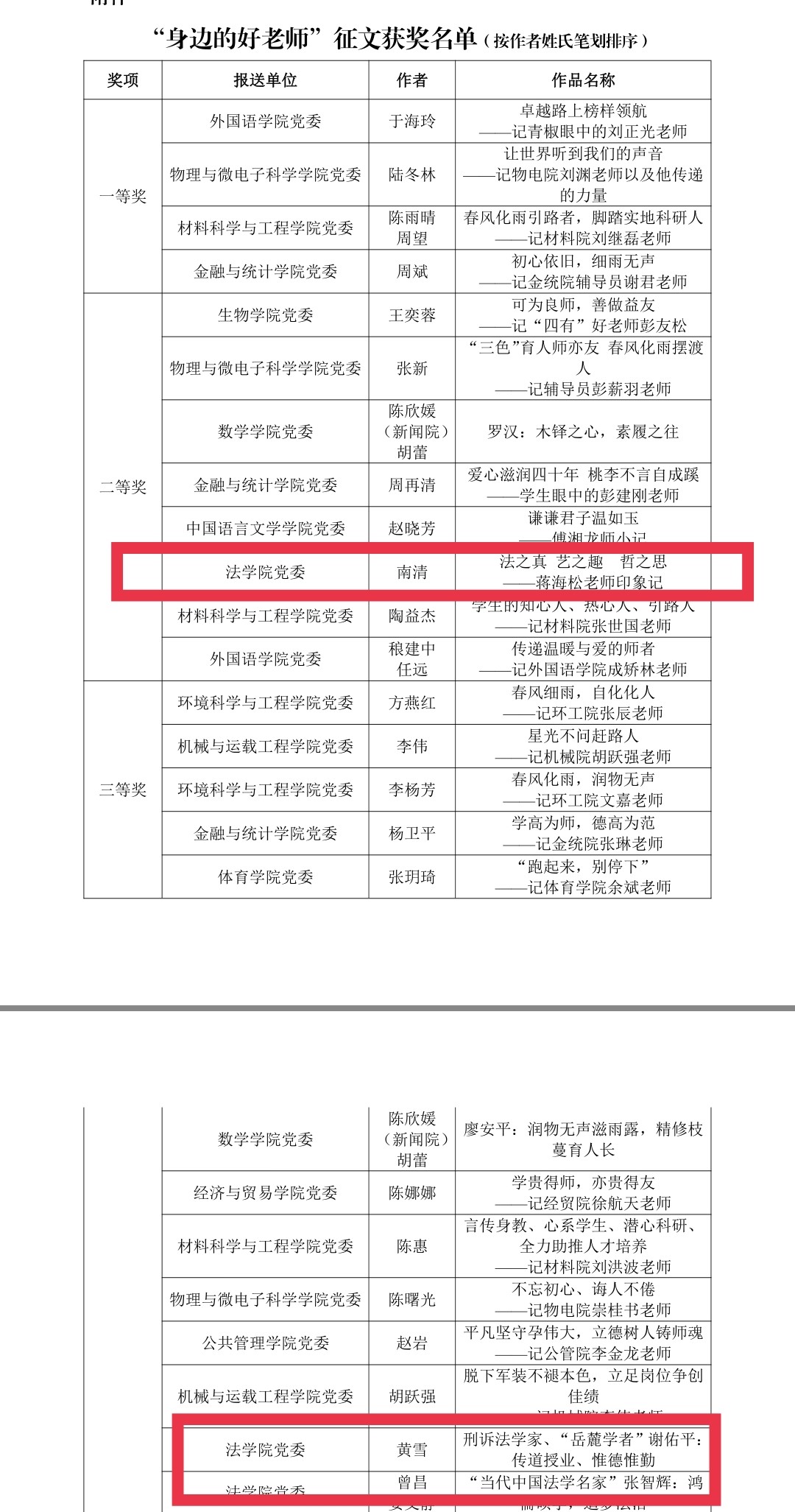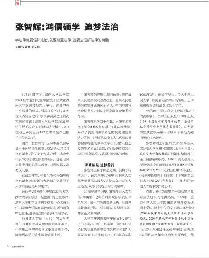 报送了近十篇稿件,其中《法之真艺之趣哲之思——蒋海松老师印象记》(作者南清)获得二等奖,《刑诉法学家、“岳麓学者”谢佑平:传道授业,惟德惟勤》(作者黄雪)、《“当代中国法学名家”张智辉:鸿儒硕学,追梦法治》(作者曾昌、娄文静)荣获三等奖。国产av