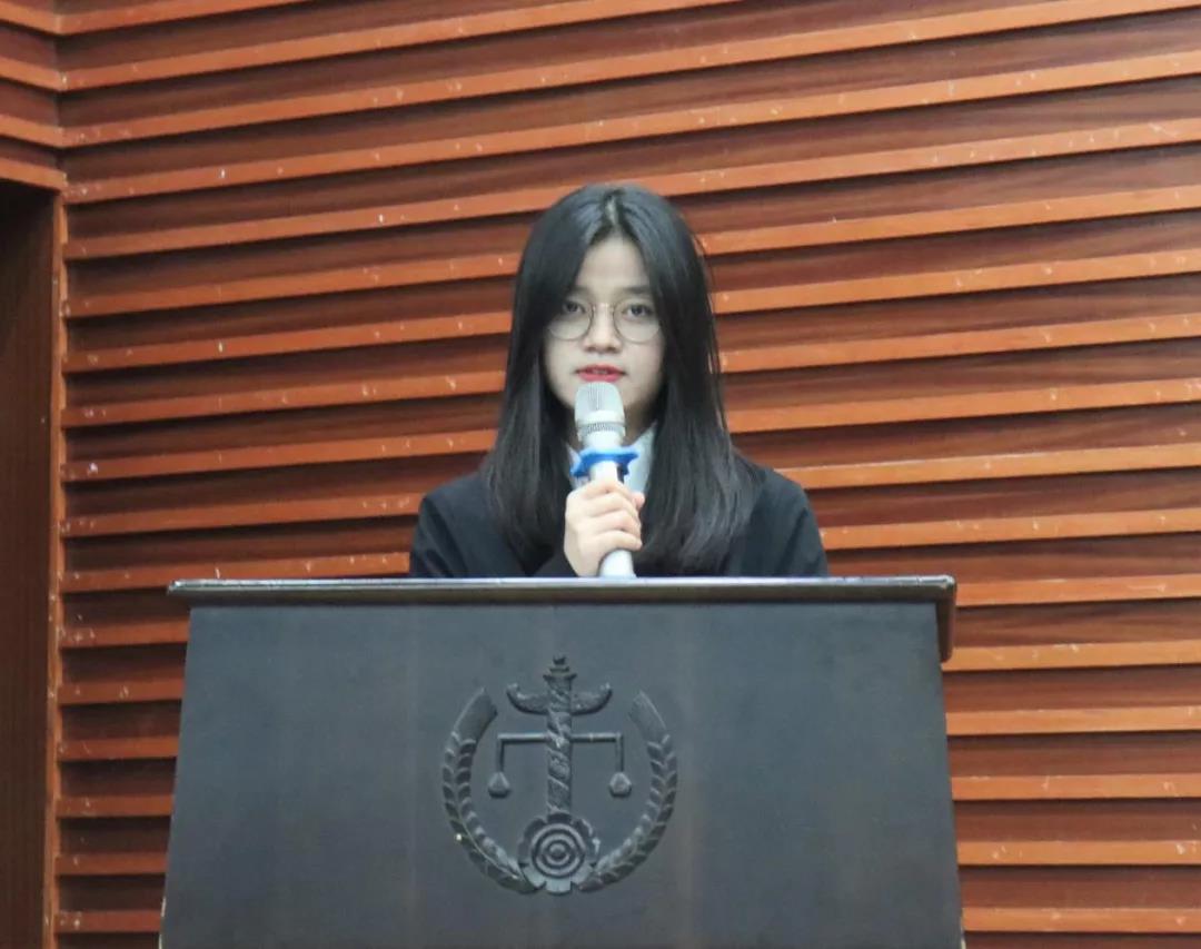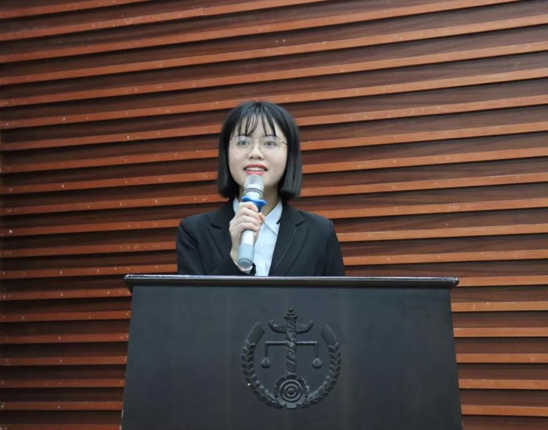 余冰琳作为代表分享活动成果。团队成员响应“到基层中去,到实践中去,到人民中去”的号召,在基层司法机关实习。
