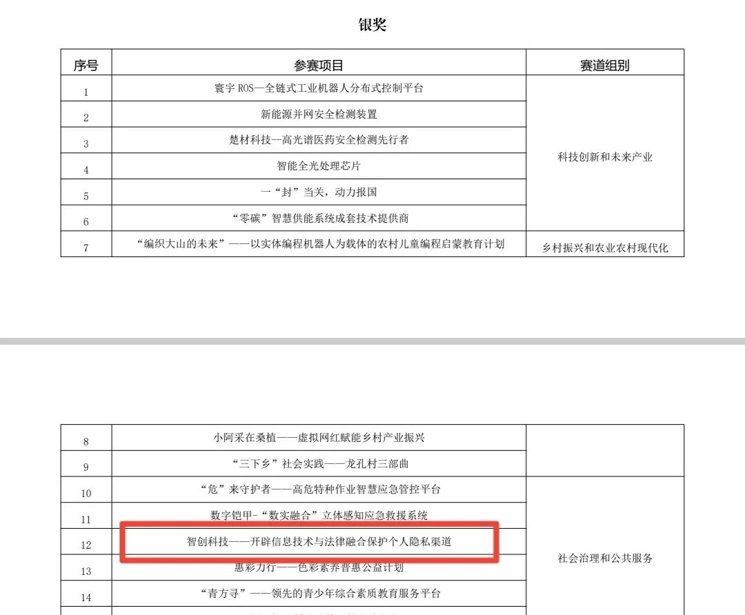 1905班朱雨欣同学主持申报、蒋海松、郑鹏程、张丹老师指导的社会治理和公共服务赛道项目“智创科技——开辟信息技术与法律融合保护个人隐私渠道”获银奖。该奖项的获得展示了我院学子的学术创新创业能力,反映了我院在本科生人才培养方面的进步,给未来我院学子积极参加创新创业竞赛提供优秀范例。