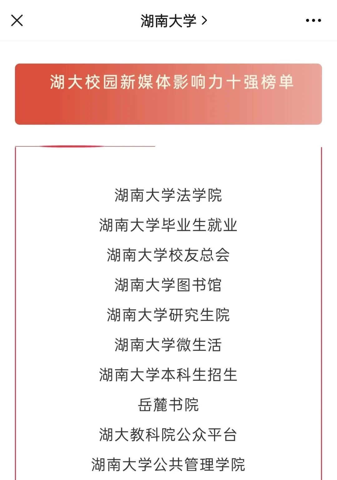 多次蝉联湖大校园新媒体影响力十强榜单,并在2021年6月榜单中跃居全校新媒体排行榜第一名。