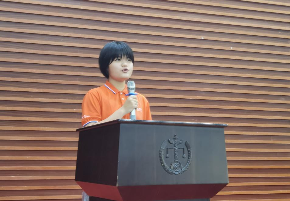 紧接着,新生代表2022级法律硕士(法学)龙孟婷同学发言。她代表同学们,向各位老师和同学自己做出郑重承诺:一、树立远大理想,在思想上明确方向。无论身处何处,都将做一个一身正气的法律人,永不偏航。二、学好专业知识,在研究中锤炼本领。同学们必将勤学苦练,不断提高自身能力。三、遵守规章制度,在日常中恪尽职守。通过同学们的共同努力,一定能够创造良好有序的学习生活环境。