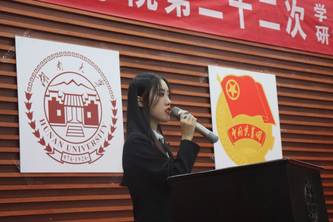 胡品老师为大会致辞。他充分肯定学院团委过去一年的工作成绩,希望学院新一届团学组织要深入学习习近平新时代中国特色社会主义思想,深入学习总书记《论党的青年工作》和在庆祝中国共产主义青年团成立100周年上的重要讲话精神,按照“四个始终成为”的要求,围绕国之大者、团之大计、学校大局、青年大事,推动工作守正创新、出彩出色,引领团员青年努力成为新时代经世致用领军人才,为建设富有历史文化传承的中国特色世界一流大学贡献力量,以优异成绩迎接党的二十大胜利召开。