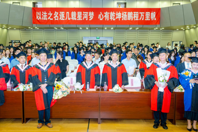 2023 年学位授予决定》,对8位法学博士、279位硕士研究生及175位本科生(包括二学位)作出授予学位的决定。随后,屈茂辉、黎四奇、张智辉、谢佑平、肖海军、郑鹏程、高中老师为全体毕业生一一正冠拨穗、颁发证书并合影留念。