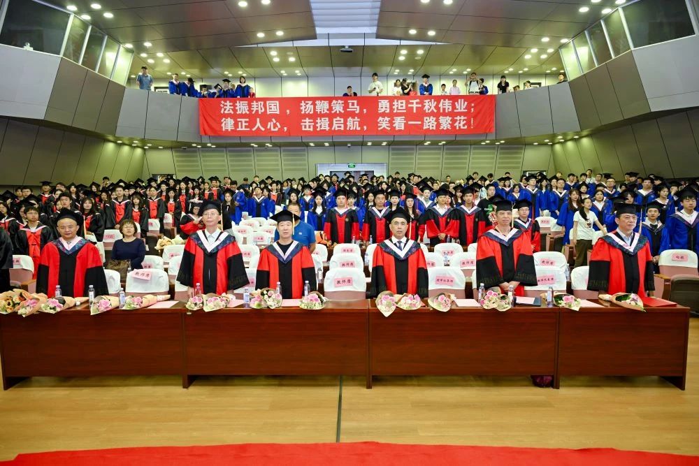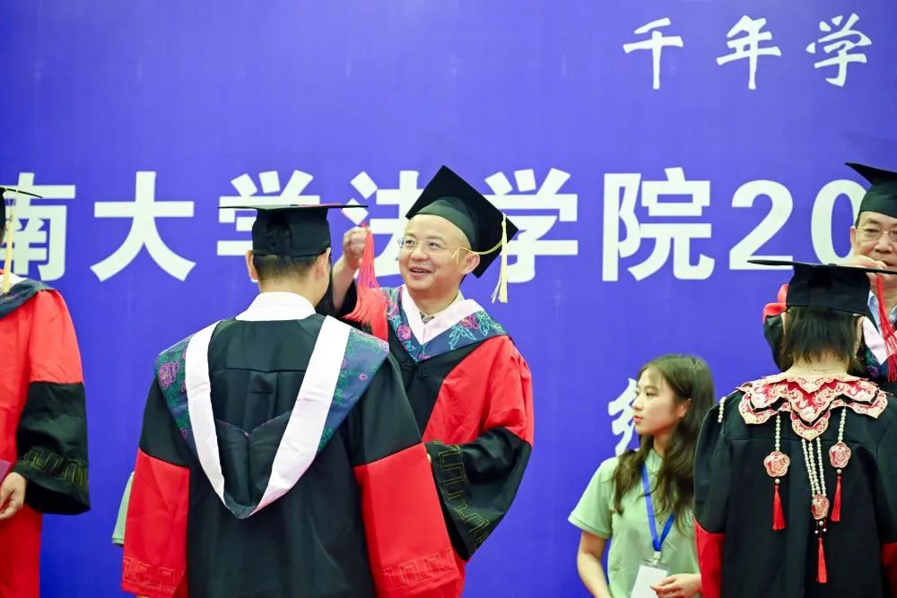 2024年学位授予决定》,对11位法学博士、262位硕士研究生及166位本科生作出授予学位的决定。随后,屈茂辉、黎四奇、谢佑平、肖海军、郑鹏程、高中老师为全体毕业生一一正冠拨穗、颁发证书并合影留念。