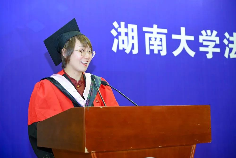 学生代表发言环节中,本科生毕业代表的法学2004班万以心同学(目前已经保研至北京大学)以“成为更好的自己”为主题分享自己的感受。首先,万以心同学深情回忆了在湖大生活的四年历程,痛苦与快乐交织,幸福与沮丧相伴,每一位同学都在这里收获了独属于自己的记忆,更重要的是,在轻松愉悦的氛围里,在生动鲜活的案例中,大家接受了极为优质的法学教育,收获了知识,增进了本领。