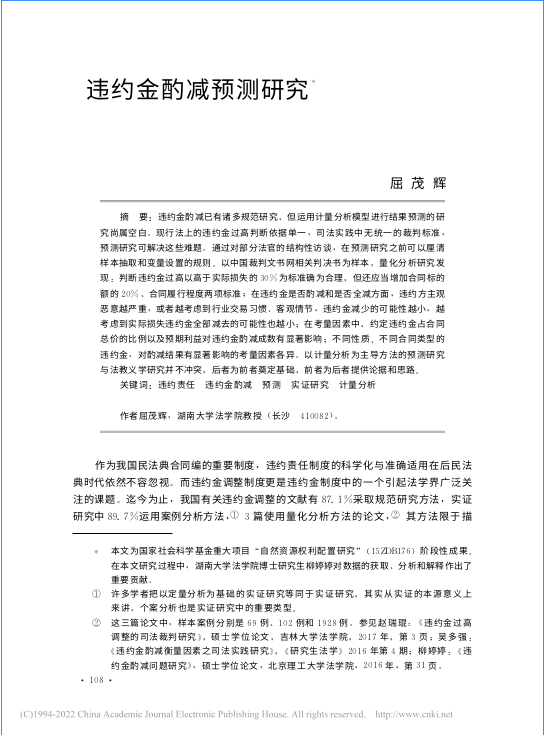 论文指出,违约金酌减已有诸多规范研究,但运用计量分析模型进行结果预测的研究尚属空白。以中国裁判文书网相关判决书为样本,量化分析研究发现:判断违约金过高以高于实际损失的30%为标准确为合理,但还应当增加合同标的额的20%、合同履行程度两项标准;在违约金是否酌减和是否全减方面,违约方主观恶意越严重,或者越考虑到行业交易习惯、客观情节,违约金减少的可能性越小,越考虑到实际损失违约金全部减去的可能性也越小。以计量分析为主导方法的预测研究与法教义学研究并不冲突,后者为前者奠定基础,前者为后者提供论据和思路。
