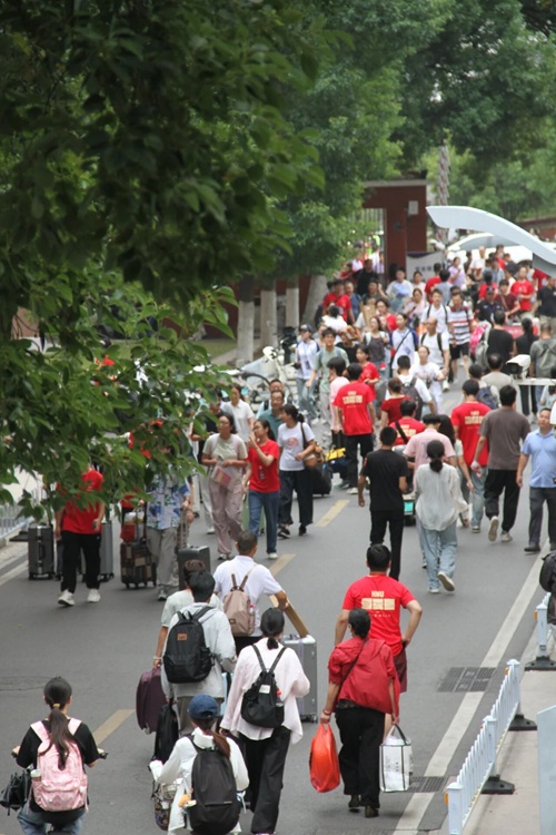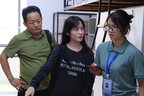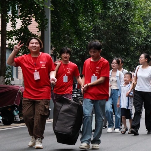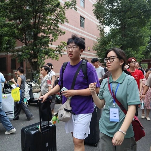 迎新志愿者们早已在天马公寓南门的我院迎新大本营集合,等候各位新生以及家长的到来。他们带着热情的笑容接过家长手中的各类行李物品,或一同推车,或协力搬运。同时,在步行至宿舍的途中,也不忘为好奇的小萌新们指出园区内的育人空间自习室以及食堂、超市、快递站的位置,帮助同学们尽快熟悉校园环境。