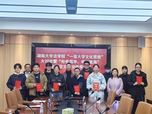 在216会议室举办一流大学文化思想内涵大讨论暨“经世笃学,明法致用”主题征文颁奖仪式,学院部分领导及征文获奖同学参加。
