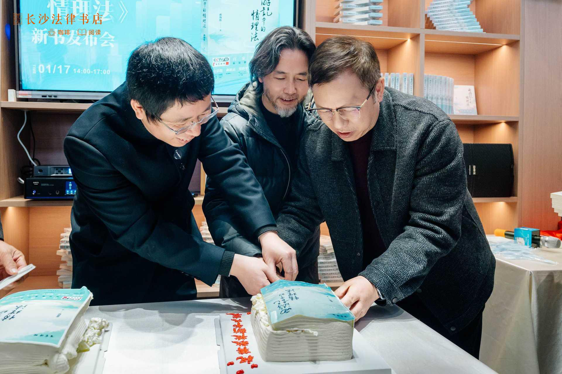 根据《〈西游记〉中的情理法》封面制作的蛋糕富有创意,夏新华、孟泽、李含英、蒋海松等嘉宾共同切开蛋糕,寓意“开卷有益”。