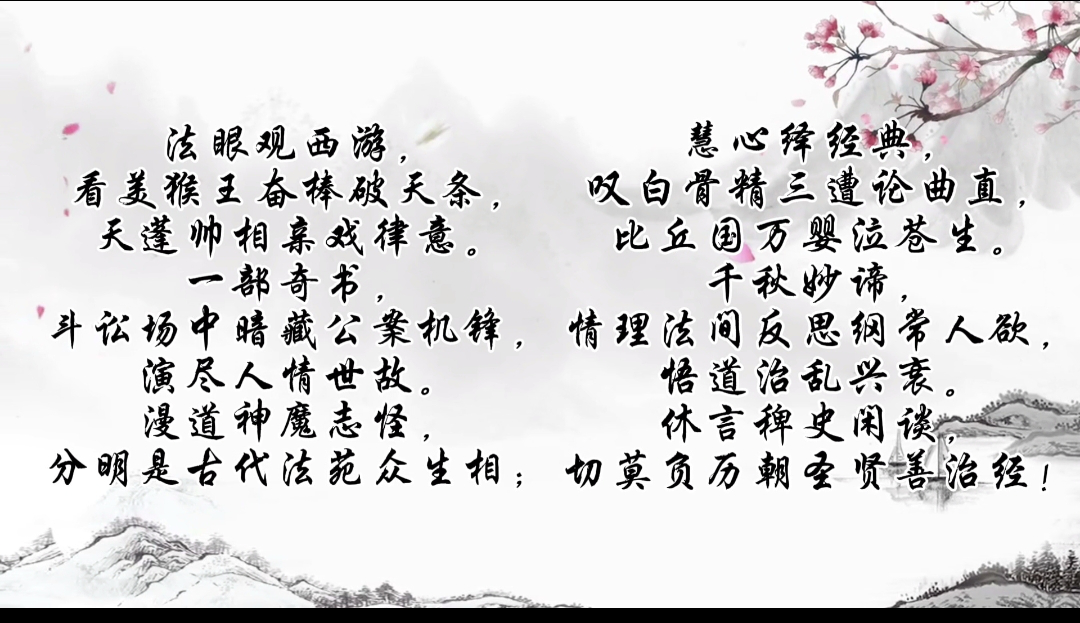 慧心绎经典,叹白骨精三遭论曲直,比丘国万婴泣苍生。千秋妙谛,情理法间反思纲常人欲,悟道治乱兴衰。休言稗史闲谈,切莫负历朝圣贤善治经!”