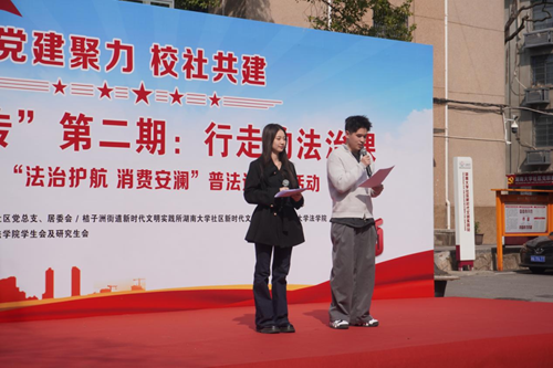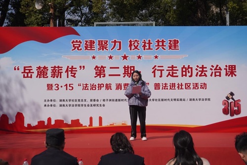 湖大社区党总支书记樊秋琳致辞,她指出法进社区是深化校社联动、推进法治教育与思政教育融合的重要载体。此次活动不仅为社区居民送上了一堂干货满满的“法治公开课”,更搭建起高校专业力量服务基层治理的桥梁,让法治精神真正走进群众、融入生活,是一堂生动的普法课、思政课。