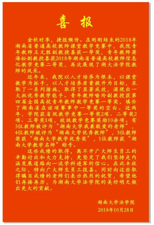 2018年10月26至28日,湖南省普通高校教师课堂教学竞赛决赛、湖南省普通高校信息化教学竞赛决赛举行,我院教师再创佳绩。其中,我院王文胜副教授以《民法学》获得湖南省普通高校教师课堂教学竞赛一等奖,蒋海松副教授以《法律与艺术》获得湖南省普通高校信息化教学竞赛二等奖,展现我院教师的良好风采和我院教学成果。