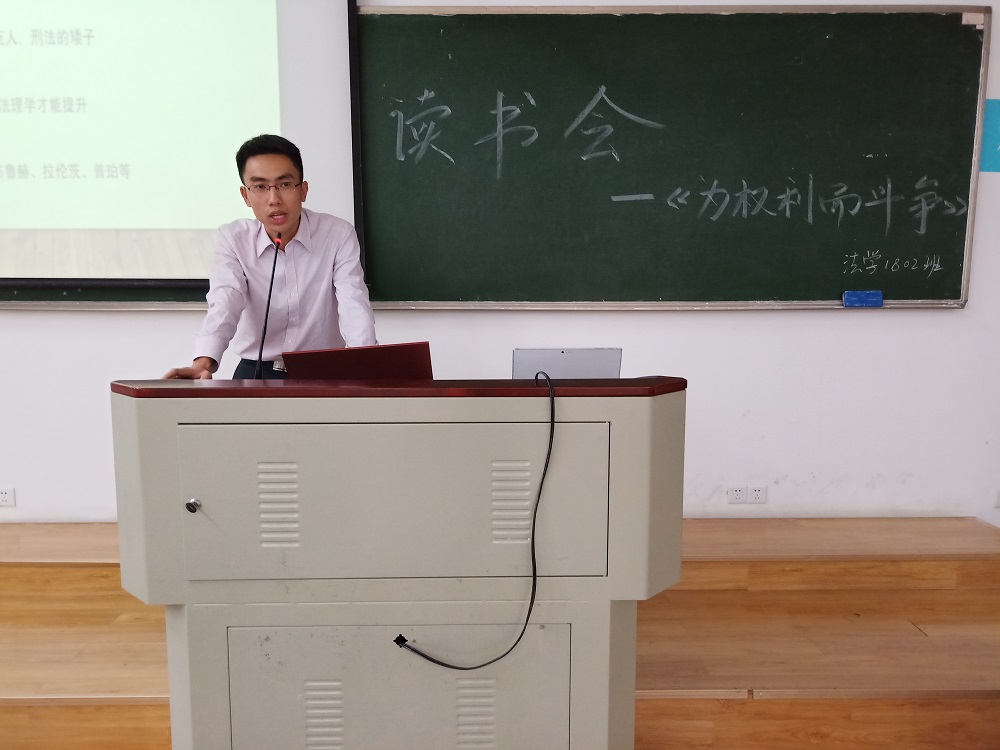 304教室展开。本次读书会选取《为权利而斗争》作为研读对象,邀请法学1802班班主任周子实担任评议嘉宾。2018级法学二班全体同学和来自其他年级的同学参加本次读书会。