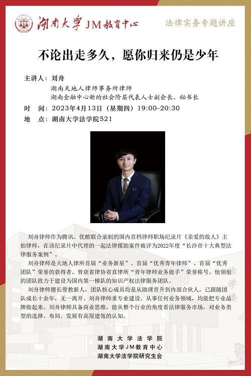 为更好地帮助同学们科学规划职业生涯,提前感受职场氛围,我院将与各实践单位开展系列法律实务讲座,本次讲座邀请到湖南天地人律所的刘舟律师为大家讲授。对想了解律师职业的同学来说,这将是一堂打开视野、打开认知格局的实务课,快来积极参与吧!