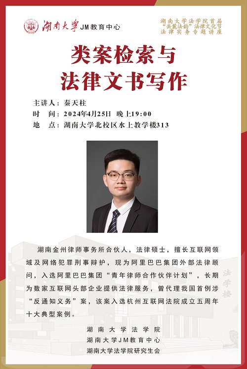 本次JM实务讲座邀请到湖南金州律师事务所合伙人秦天柱为大家讲述类案检索与法律文书写作,帮助大家了解相关实务问题,欢迎同学们积极参与!