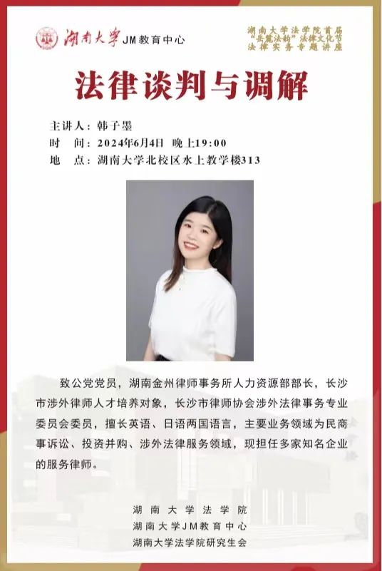 本次JM实务讲座邀请到湖南金州律师事务所律师韩子墨、李雨晨为大家讲述法律谈判与调解,帮助大家了解相关实务问题,欢迎同学们积极参与!