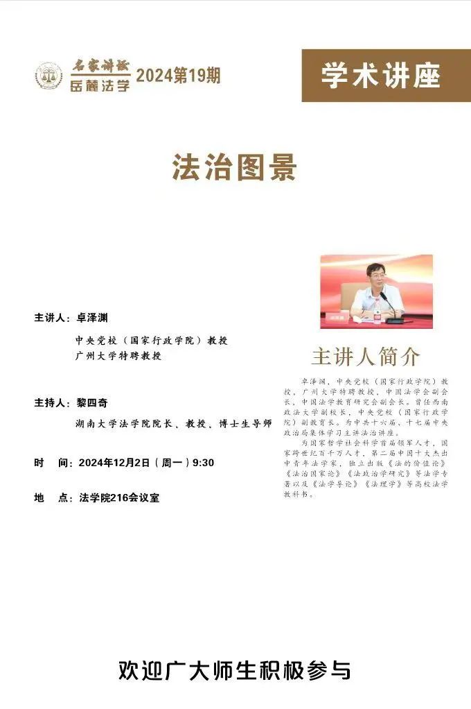 卓泽渊,中央党校(国家行政学院)教授,广州大学特聘教授,中国法学会副会长,中国法学教育研究会副会长。曾任西南政法大学副校长,中央党校(国家行政学院)副教育长。为中共十六届、十七届中央政治局集体学习主讲法治讲座。