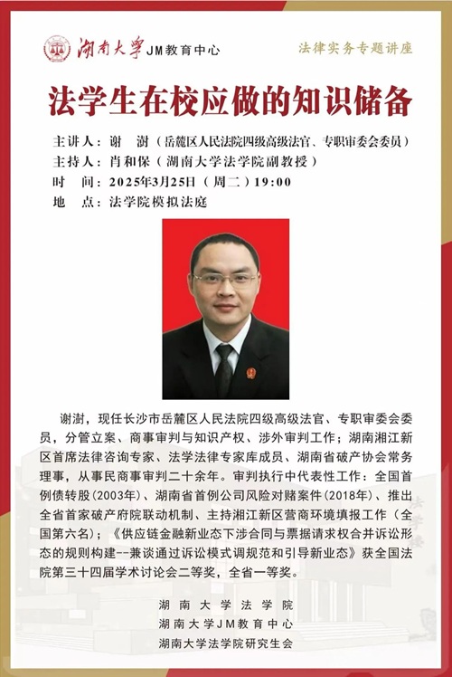 本次JM实务讲座邀请到长沙市岳麓区人民法院四级高级法官、专职审委会委员谢澍法官为大家讲述法学生在校应做的知识储备,帮助大家了解相关问题,欢迎同学们积极参与!