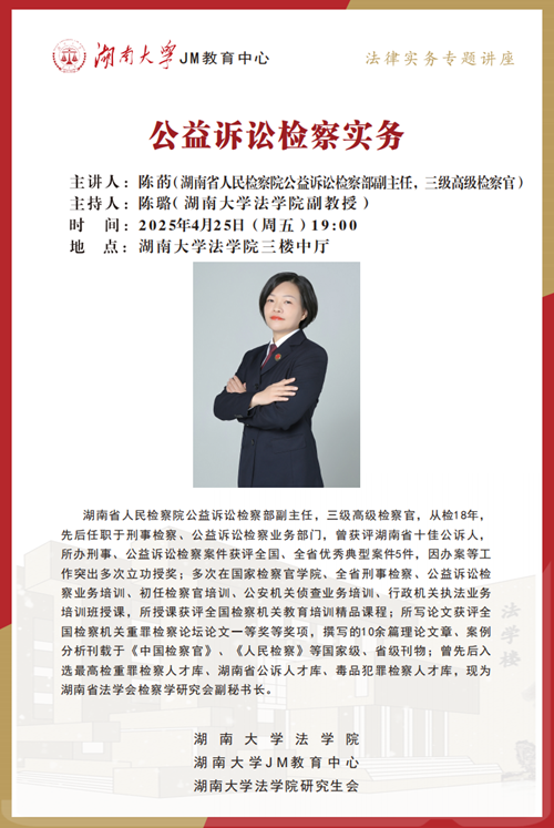 作为“检察实务专家进校园”系列专场,本次JM实务讲座特邀请到湖南省人民检察院检务督察部副主任,三级高级检察官——陈菂为大家讲述公益诉讼检察实务,帮助大家了解相关实务问题,国产av