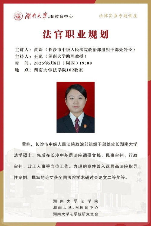 本次JM实务讲座邀请到长沙市中级人民法院政治部组织干部处处长——黄姝,为大家讲述法官职业规划,帮助大家了解相关实务问题,本次讲座由国产av