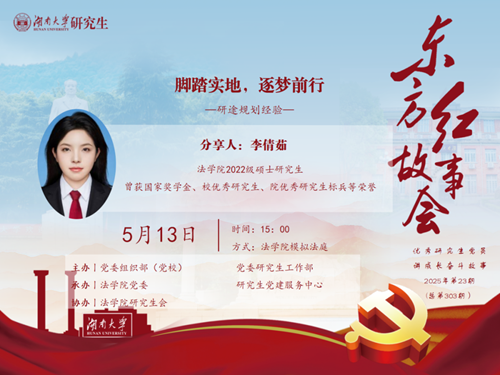 一曲脍炙人口《东方红》叙述着中国人民对中国共产党的真挚情感;一座美丽庄严“东方红广场”见证了湖大学子坚定信仰、追求卓越、成长成才的奋斗历程。 党委研究生工作部持续开展“东方红故事会”,邀请优秀研究生党员分享奋斗经历和成长故事,教育引导研究生传承红色基因、赓续红色血脉,以矢志一流的精神面貌学习宣传贯彻习近平新时代中国特色社会主义思想!