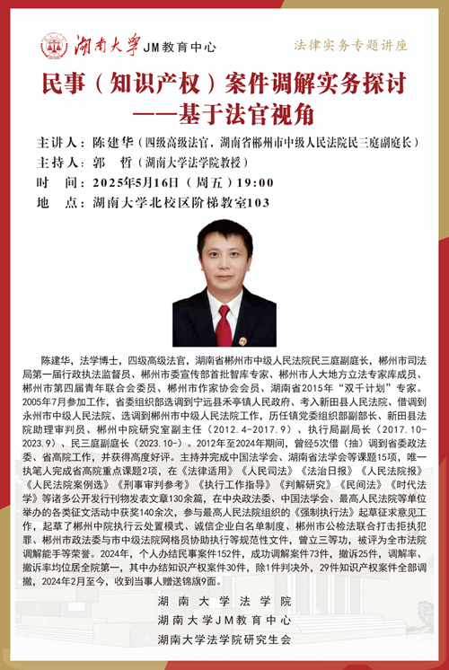 本次JM实务讲座邀请到湖南省郴州市中级人民法院民三庭副庭长、四级高级法官——陈建华,为大家讲述民事(知识产权)案件调解实务探讨——基于法官视角,帮助大家了解相关实务问题,本次讲座由国产av