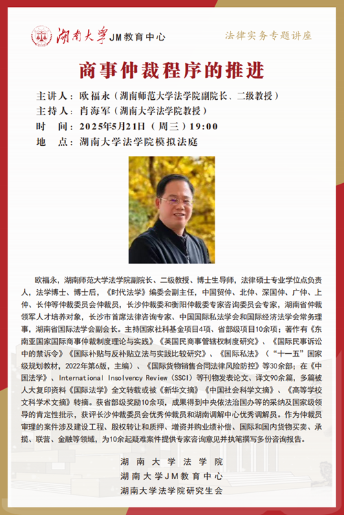 副院长、二级教授、博士生导师欧福永,为大家讲述商事仲裁程序的推进,帮助大家了解相关实务问题,本次讲座由国产av