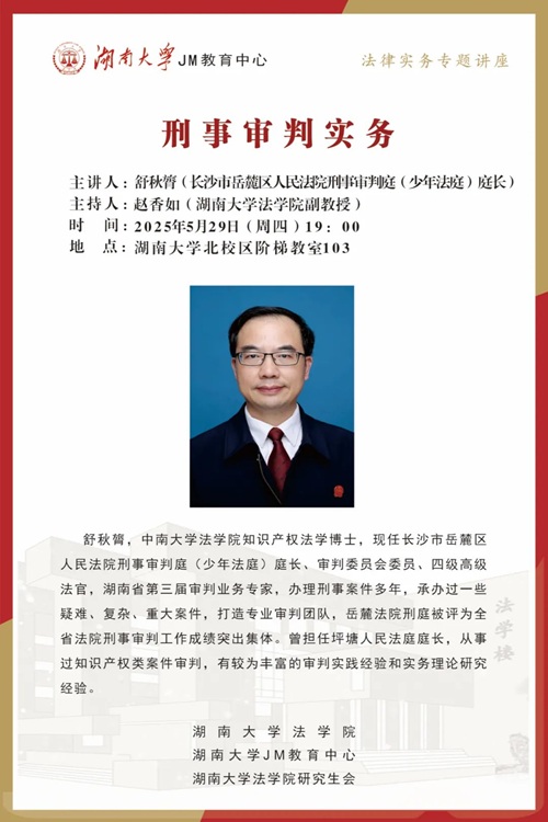 本次JM实务讲座邀请到长沙市岳麓区人民法院刑事审判庭(少年法庭)庭长、四级高级法官舒秋膂,为大家讲述刑事审判实务,帮助大家了解相关实务问题,本次讲座由国产av