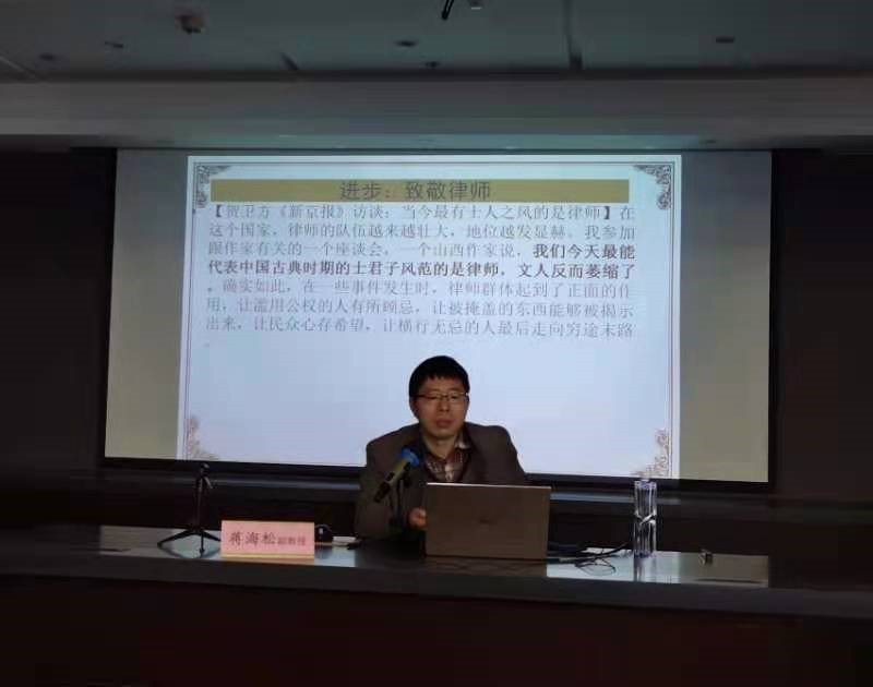 讲座伊始,蒋海松教授引用罗马皇帝的话:“我们不仅把身披盔甲、手持剑盾奋战的人视为战士,同样认为律师也是战士”致敬了律师。其后,蒋海松教授围绕新媒体改变中国、新媒体下的混乱生态、律师的法庭辩护与公共表达、如何在新媒体时代进行理性的公共表达等方面进行了阐述。