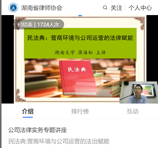 副院长蒋海松副教授担任本次讲座的主讲嘉宾。省律协副会长薛宏志、李凤祥,省律协公司委主任梁翊芳,副主任罗峥、刘志平、李泳靓及律师代表、企业代表等几十人现场参与本次讲座。讲座由湖南银联律师事务所高级合伙人、省律协公司法律事务专业委员会副主任刘志平律师主持。