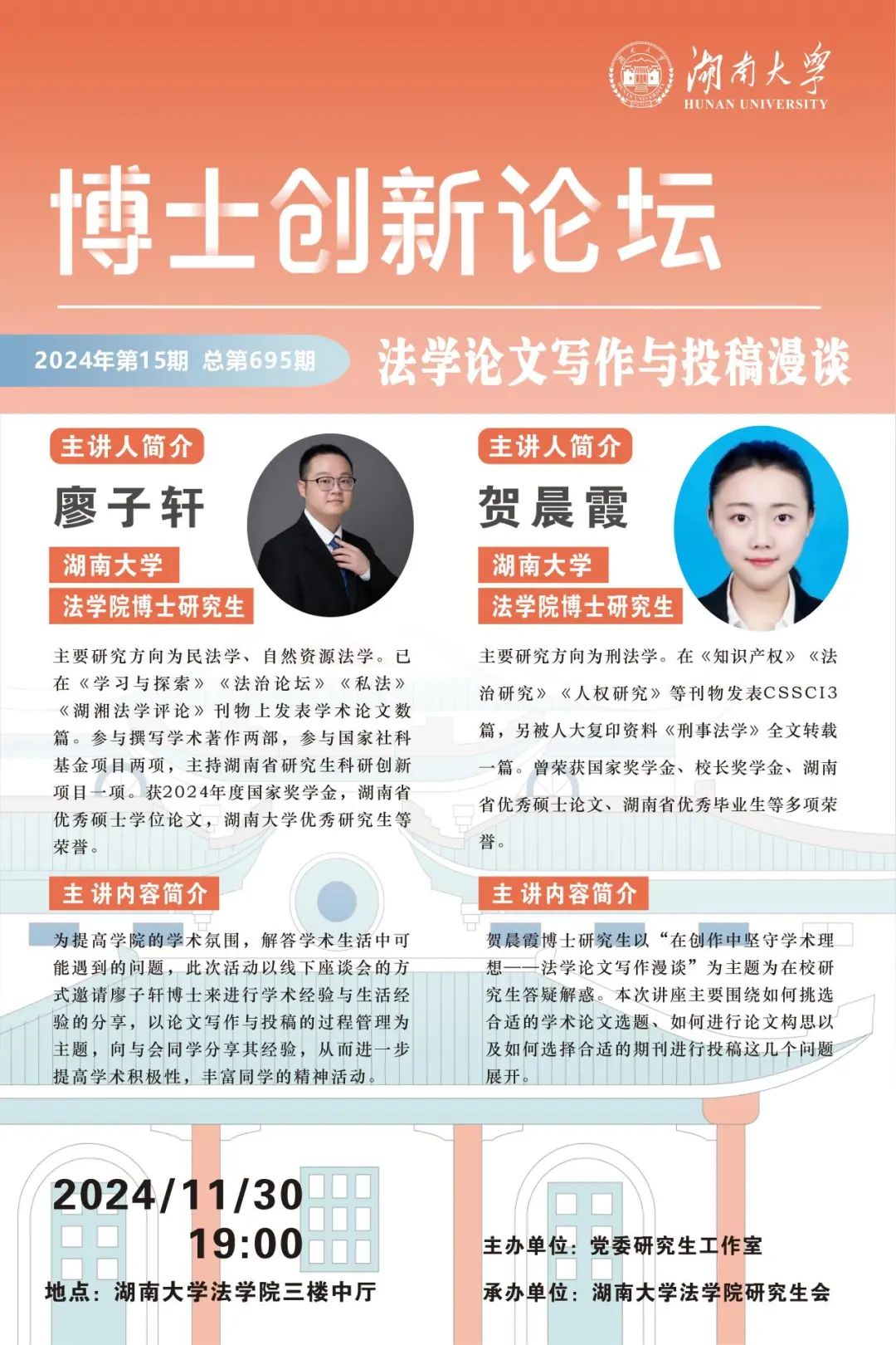 为提高学院的学术氛围,解答学术生活中可能遇到的间题,此次活动以线下座谈会的方式邀请廖子轩博士来进行学术经验与生活经验的分享,以论文写作与投稿的过程管理主题,向与会同学分享其经验,从而进一步提高学术积极性,丰富同学的精神活动。