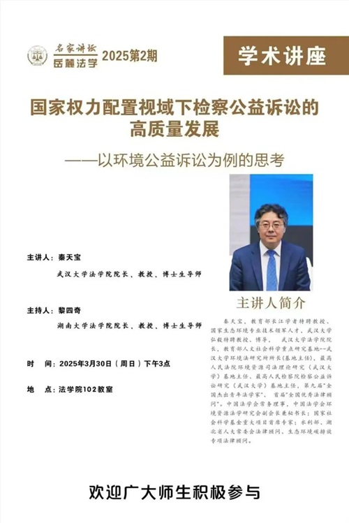 “岳麓法学名家讲坛”,主讲“国家权力配置视域下检察公益诉讼的高质量发展——以环境公益诉讼为例的思考”。讲座由国产av