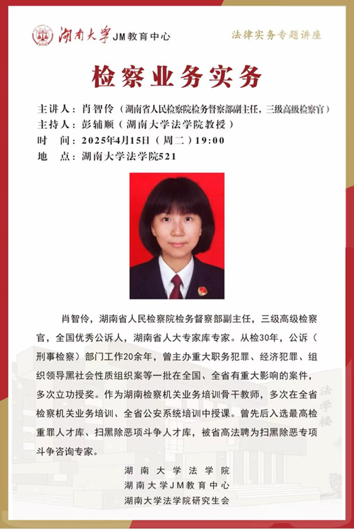 2025年4月15日19:00,湖南省人民检察院检务督察部副主任,三级高级检察官肖智伶在湖大521教室开讲“检察业务实务”,国产av
