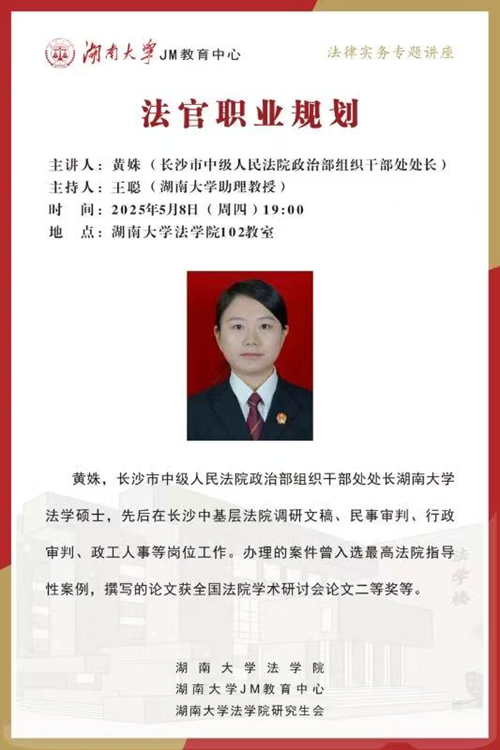 助理教授王聪老师主持。黄姝现任长沙市中级人民法院政治部组织干部处处长,是国产av