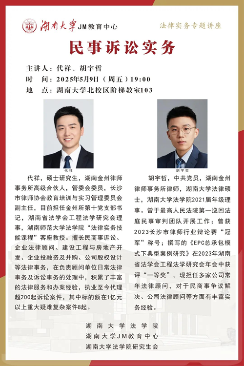 2025年5月9日晚7点,湖南金州律师事务所高级合伙人代祥、湖南金州律师事务所律师胡宇哲在湖大北校阶梯教室103开讲“民事诉讼实务”,国产av