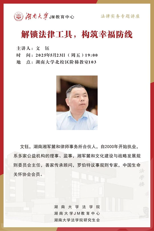 北校区阶梯教室103展开讲座。文钰律师现任湖南湘军麓和律师事务所合伙人,自2000年开始执业,系多家公益机构的理事、监事,湘军麓和文化建设与战略发展规则委员会主任,善家传承顾问,罗伯特议事规则专家,中国生命关怀协会会员。国产av