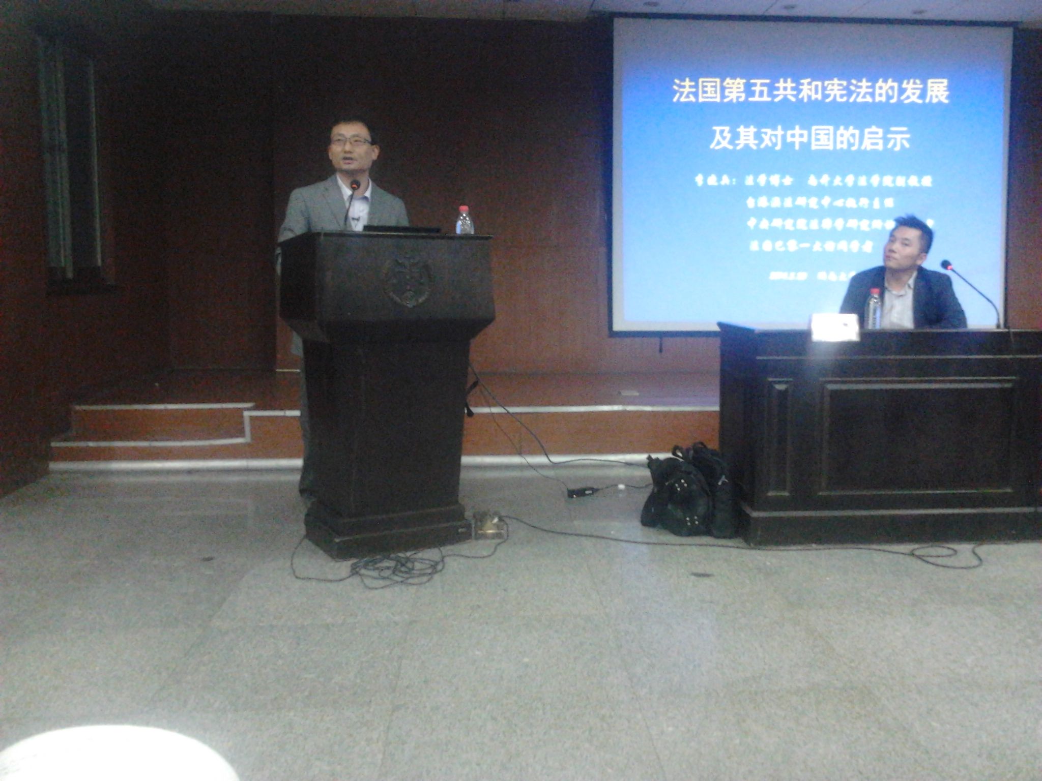 2014年5月20日晚上七点,法学博士、南开大学国产av 副教授李晓兵受邀来我院主讲法国第五共和国宪法的发展及其对我国的启示学术讲座,国产av 副教授、法国尼斯大学法学博士徐琳主持。李晓兵副教授还是台港澳法研究中心执行主任、法国巴黎一大访问学者,对法国及法国宪法有非常深入的研究。