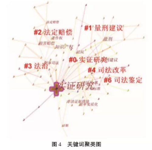 在通过citespace软件所得出的关键词共现关系的基础上,进一步进行关键词聚类分析,聚类 结果显示Q值为0.6556且S值为0.5119,说明分析结果中的结构划分是显著的、聚类结果具有可靠性。如图4所示,依据所占比重大小,聚类分析共得到实证研究、量刑建议、法定赔偿、法治、司法改革以及司法鉴定在内的6个主要类别。单从类别名称来看,以学科划分为标准,基于裁判文书法学实证研究成果中涉及最广泛的“量刑建议”相关内容应属刑事诉讼领域,而广泛程度紧随其后 的“法定赔偿”相关内容则属于知识产权领域。关于其他类别,法治、司法改革以及司法鉴定属于全 局性或者说普遍性关键词,则需要通过分析本类别中的关键词共现关系,在明确本类研究成果论证 基点的基础上,来明确其所在研究成果涉及之具体研究领域。故此,为明确各类别研究成果所归属的具体学科领域,我们继续结合各类别中所包含的主要关键词进行探讨。