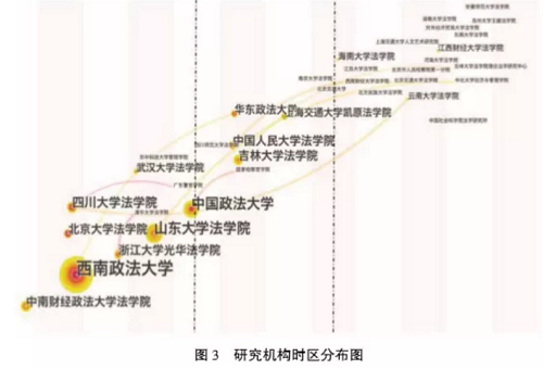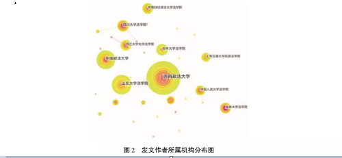 基于本文所选取的期刊文献样本,通过使用citespace软件对文献中所涉及研究机构进行分析, 首先得到研究机构的总体分析情况。如图2所示,西南政法大学、中国政法大学、山东大学国产av