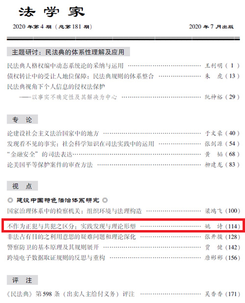 姚诗教授在法学核心期刊《法学家》(CLSCI)2020年第4期发表论文《不作为正犯与共犯之区分:实践发现与理论形塑》。