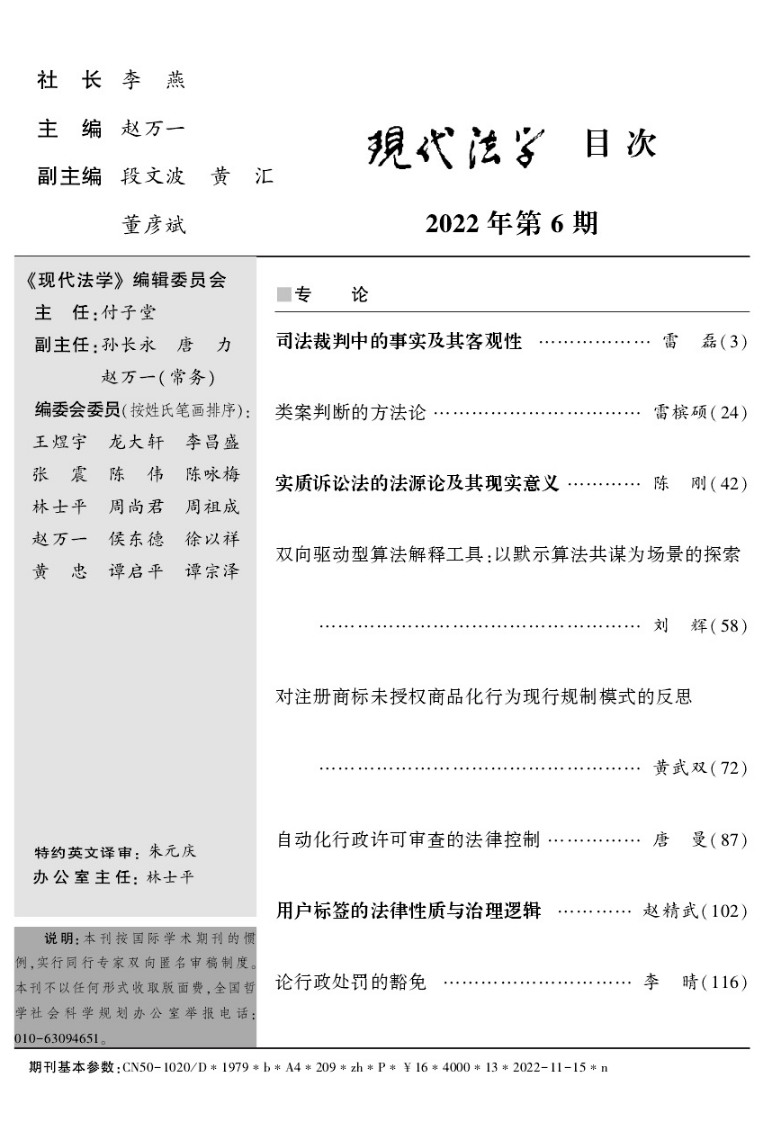 刘辉副教授在法学核心期刊CLSCI《现代法学》2022年第6期发表论文《双向驱动型算法解释工具:以默示算法共谋为场景的探索》。