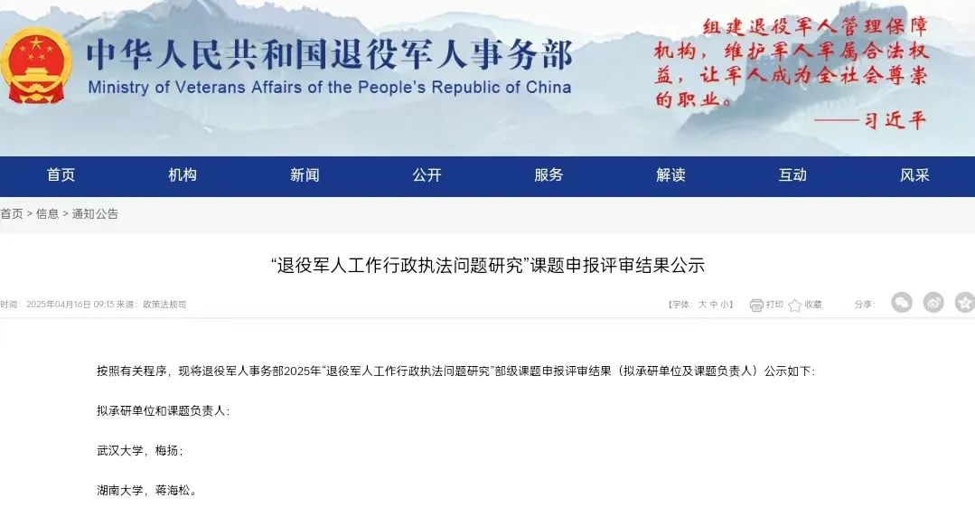 2025年上半年,退役军人事务部公布了2025年部级课题“退役军人工作行政执法问题研究”申报评审结果,国产av