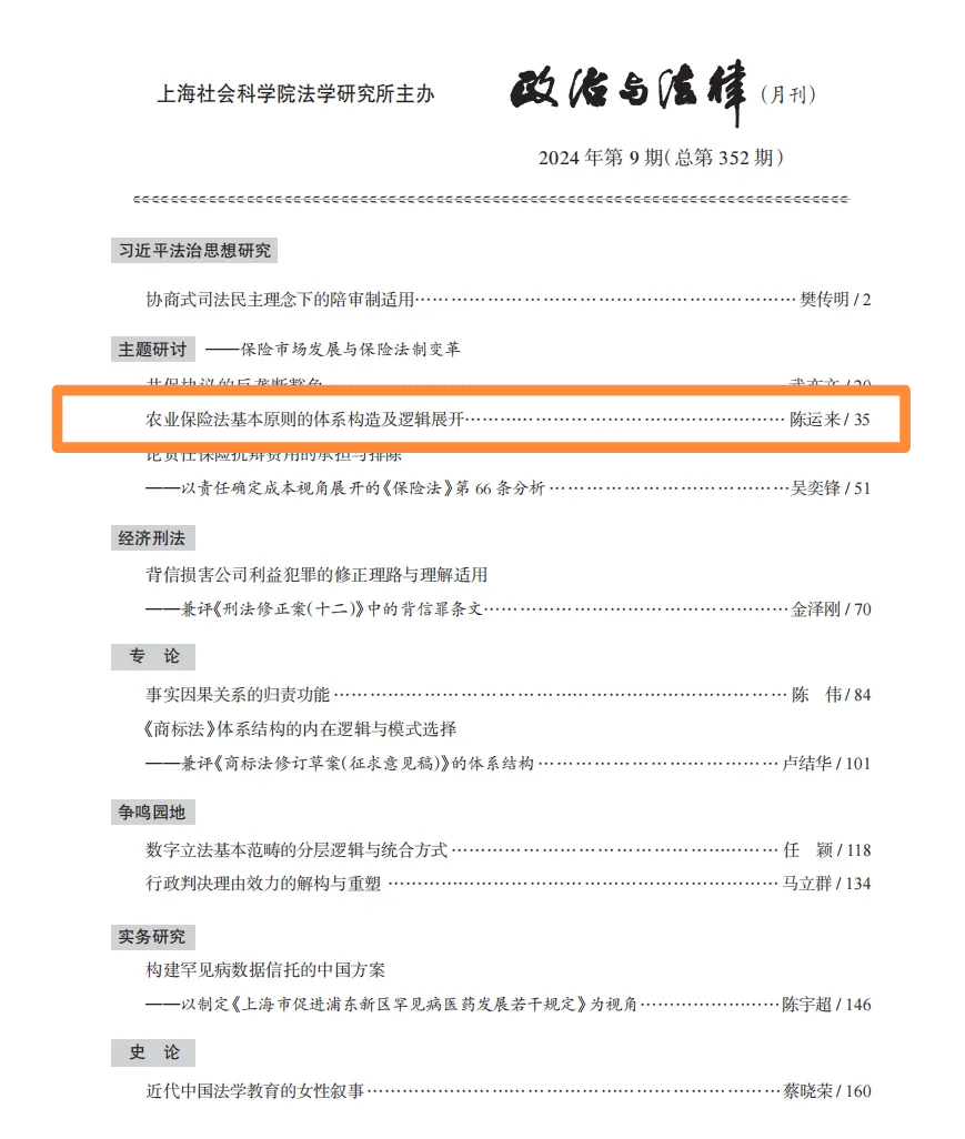 近日,国产av 陈运来副教授在《政治与法律》(CLSCI来源期刊)2024年第9期发表论文《农业保险法基本原则的体系构造及逻辑展开》。