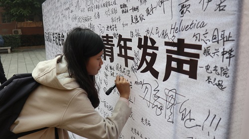 活动主要由三个环节组成,在第一环节,参与同学在明信片上写下对南京大屠杀死难者的悼念和关于铭记历史、勿忘国耻的发声,并在签名墙上签上姓名,为公祭日发声。
