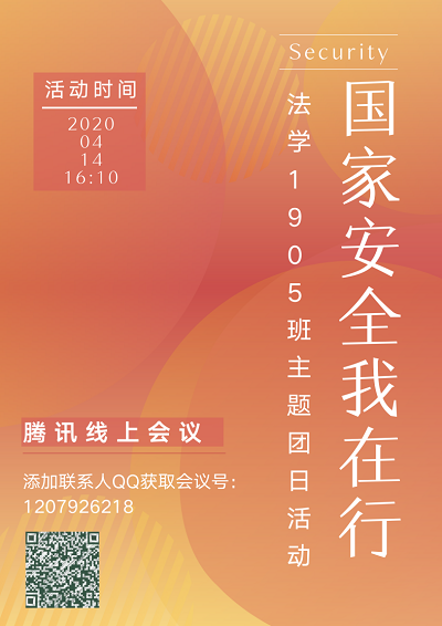 法学1901班通过线上会议组织学习习近平总书记关于总体国家安全观的重要论述及相关法律法规,共同学习“平安湖大在线”微信平台中关于国家安全教育的系列内容并观看相关影视作品,据此进行在线讨论。除此之外,还结合当下新冠肺炎疫情防控形势,以知识竞答的方式,让同学们在轻松愉快的氛围中收获公共安全、生物安全等相关知识。
